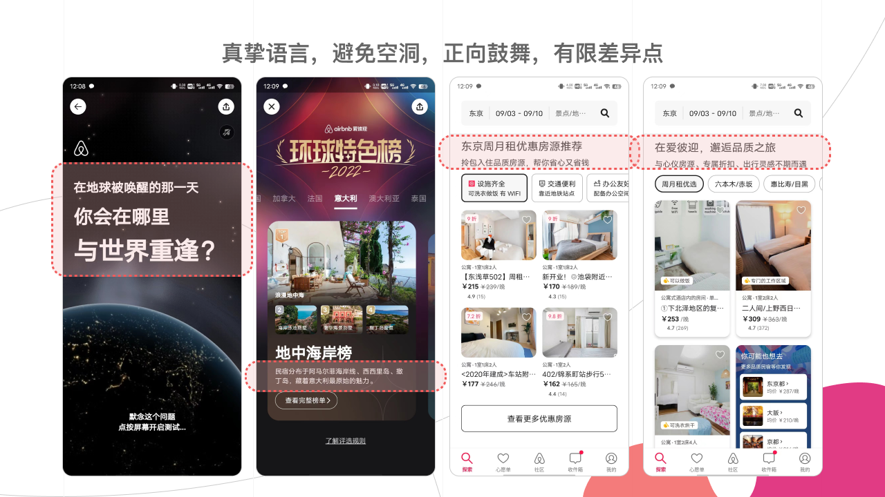 善用正向鼓舞,避免不友好的字/词。比如最初的描述是“在海边林中的海景房”。海景房对于部分人可能会有不佳的体验,存在歧义。如果使用些熟悉又陌生感的古典风格,“俯瞰地中海的雨林小屋”,传达了同样的信息,置身场景的感受却变得更加清晰、心动了。