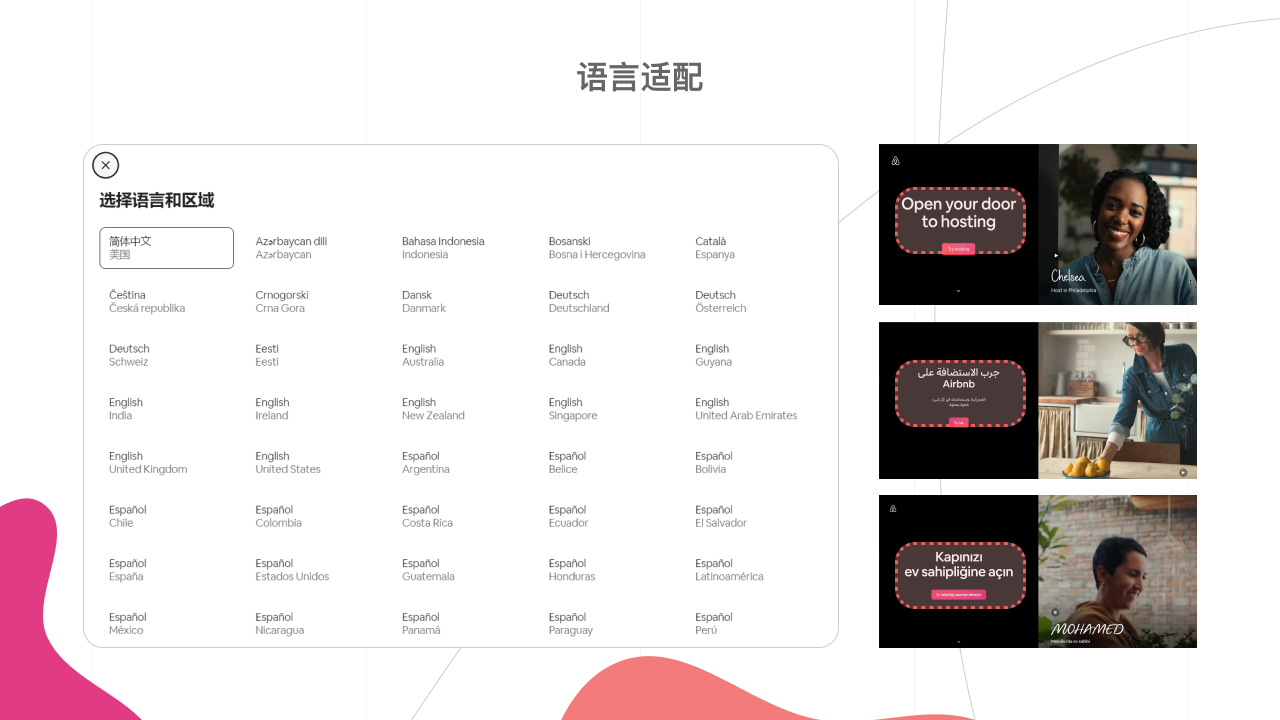 应用会根据设备的语言配对默认地区、语言和货币。对于内容,联合本土的设计团队参与制作(比如适配当地文字的版式、重心,拍摄当地风情的图片,根据当地产品的使用习惯进行相似化)。通过针对不同的国家适配当地的内容、文字和语法,持续不断扩大覆盖范围,期望带给每个人归属感和宾至如归的感觉(截止目前Airbnb已为全球用户适配了80种语言)。